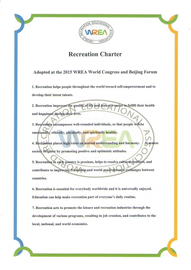 Recreation Charter : Adopted at the 2015 WREA World Congress and Beiji… Super administr… 0 61829 2015.06.26 13:57 Recreation Charter : Adopted at the 2015 WREA World Congress and Beijing Forum