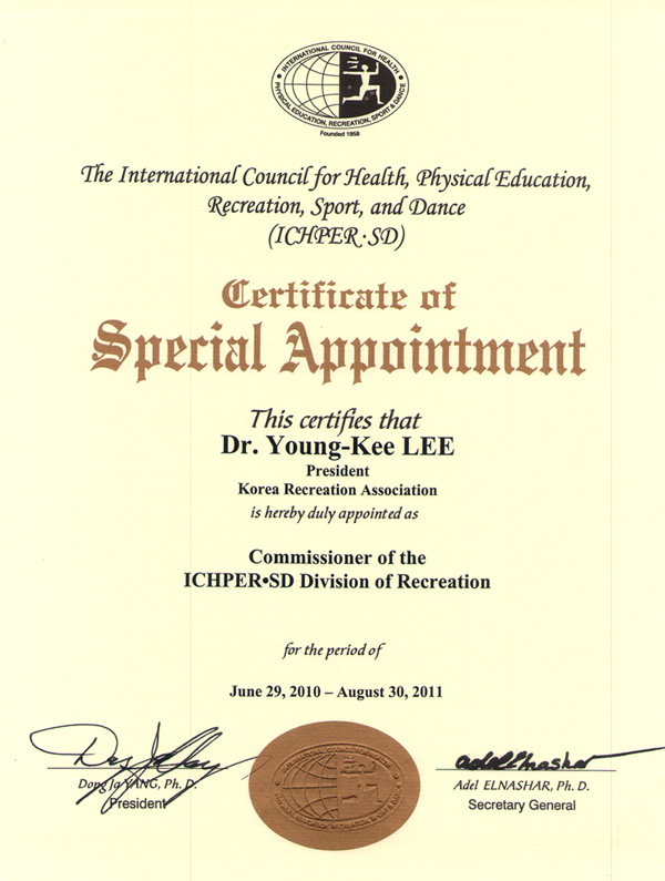 Selection of our association’s Young Kee Lee as Recreation Commissioner of ICHPER.SD